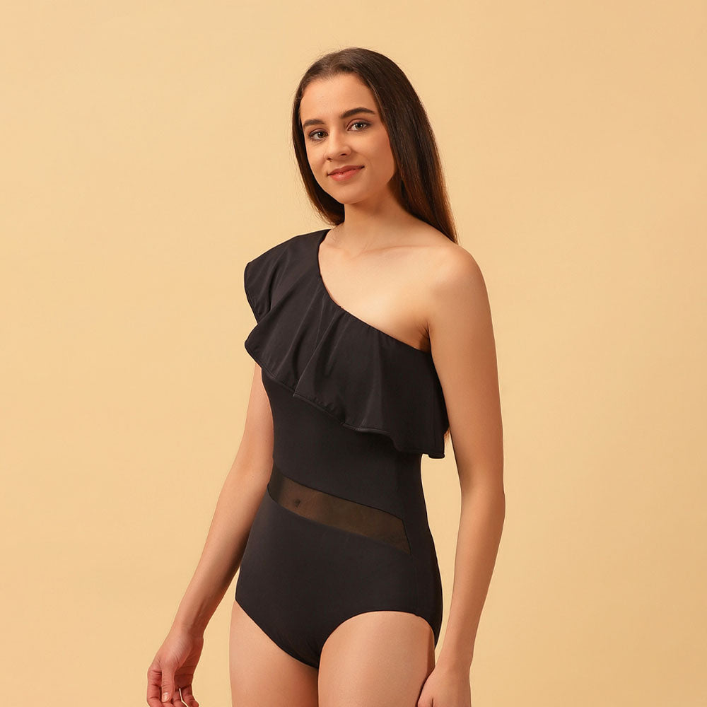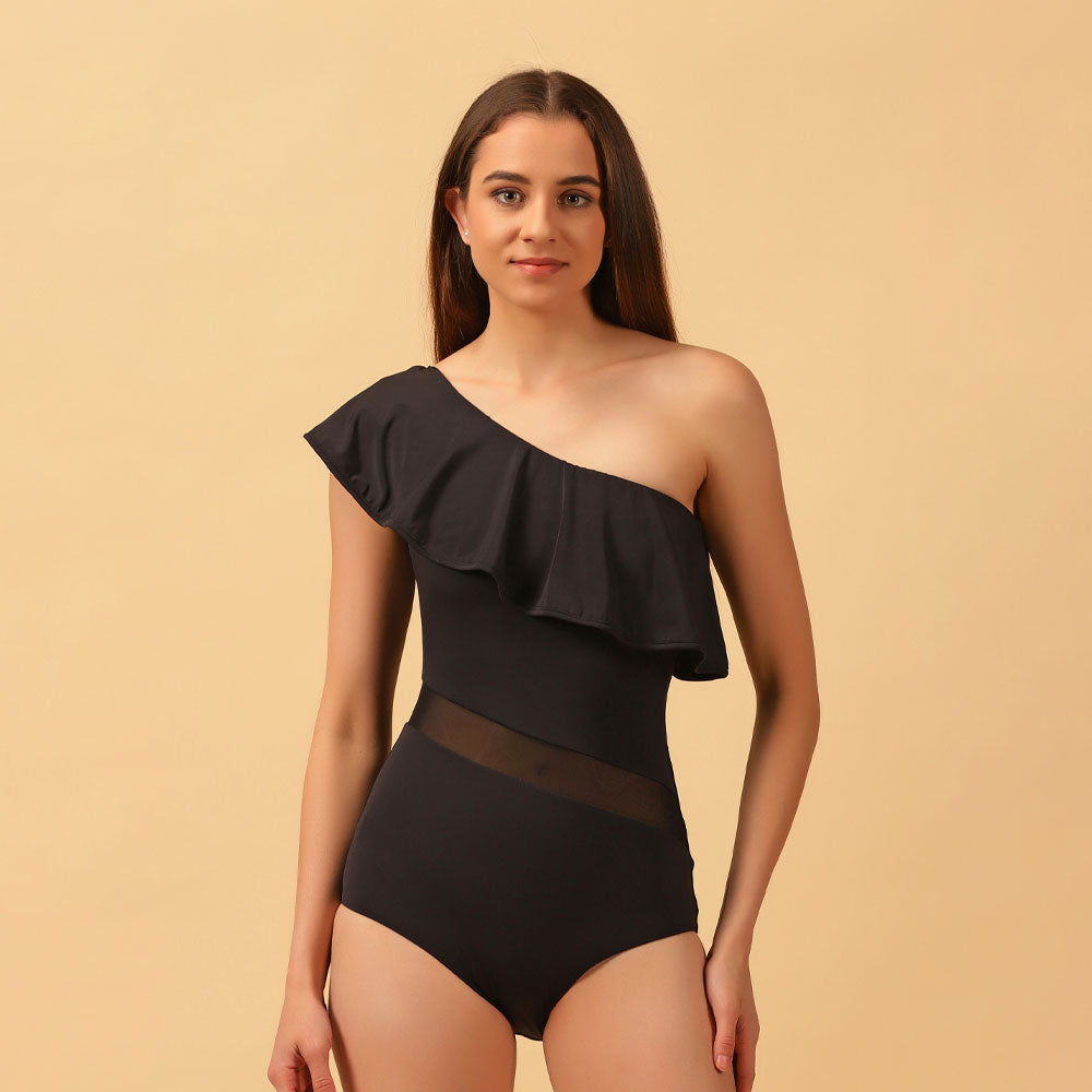 A Super fun Black one shoulder swimsuit. It's enhanced by the sleek mesh detail on waist and flared ruffles on the one shoulder neckline making perfect to flaunt in!