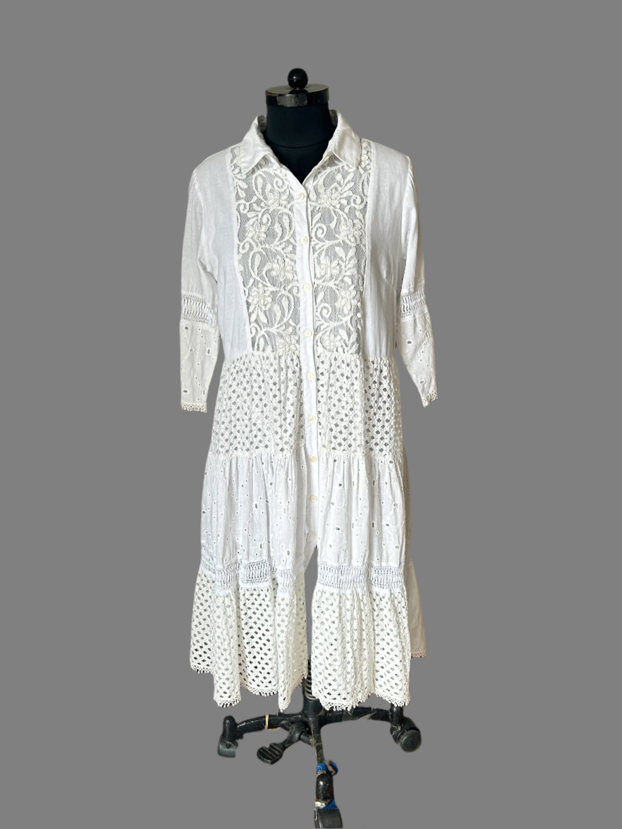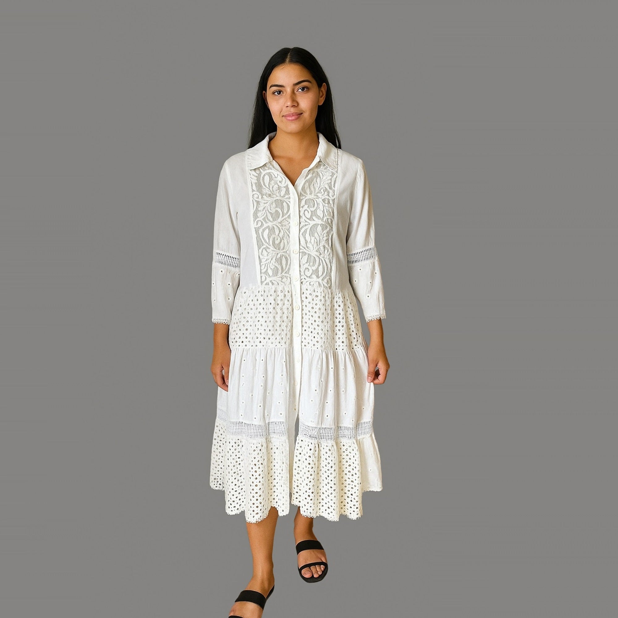 Get ready to enjoy your vacation in this pretty schiffli dress. The dress has shirt collar with bead work on the neck yolk.