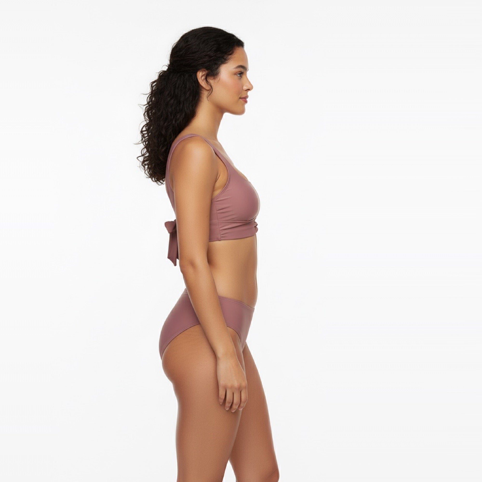 We got your next summer look covered with this bikini set featuring a bralette with a square neck, ruched front, shoulder straps, and a back tie, as well as a pair of hipster bottoms with a mid-rise waist and retro full-coverage bum.