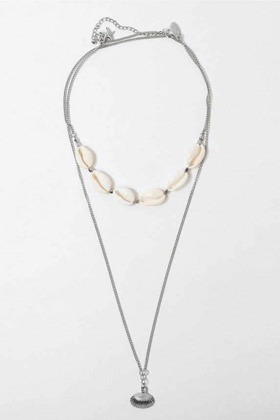 A high-polish necklace featuring seashell pendant, layered rolo chains, complete with a lobster-clasp closure.