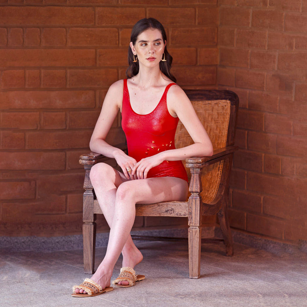 A Shimmery red berry swimsuit with a gold rivets scattered on the waist. It's enhanced with the classic neckline, a deep back and its sheen. Its double layered and padded (detachable pads) making it super comfortable to flaunt on the beachy sands!
