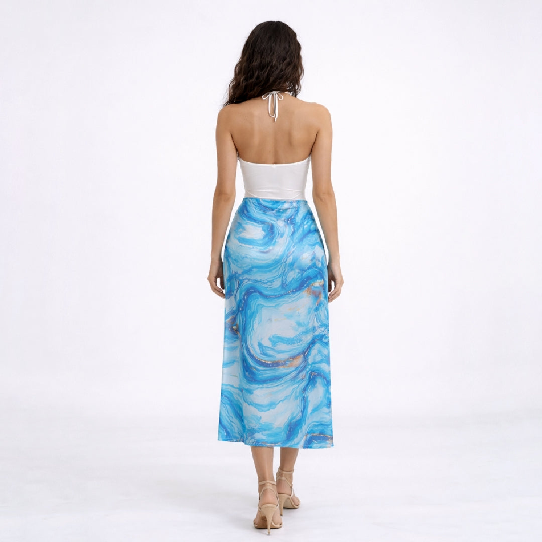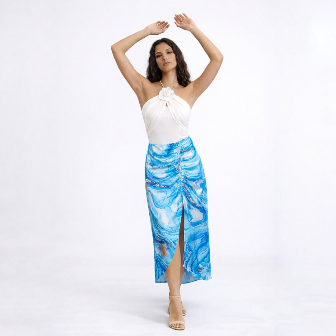 A statement printed cover-up skirt inspired by fluid movement and ocean tones. Designed with a ruched front and slit, it adds drama and color while remaining light and effortless.