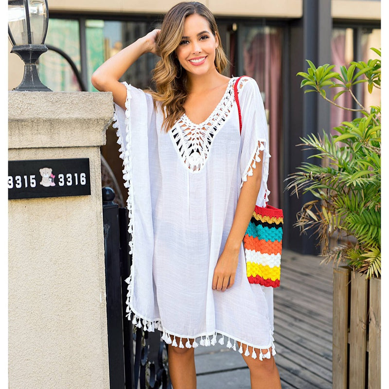 3. Short sleeve, mini length, hollow out, crochet lace, tassels, backless, charming and attractive. Simple but fashion. Loose fit. Prevent skin damage when you play on the beach.